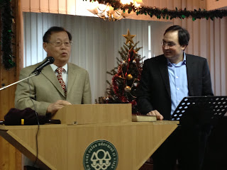 From 10 - 12, Dec. 30, a worship service took place at the Young Lee's Missionary Training Center. The worship consisted of prayers, hymns, offering, Pastor Young Lee's words of encouratement and admonition, songs of praise such as a family coming out and serving a special music program. Another couple served a special song. A missionary Sandu came out and served a brief message. The next program was myself coming out and making a special report on God's work throgh the UBF ministry. Pastor Young Lee's wife Esther quietly served all the attendants with prayers, serving food, greetings, etc.